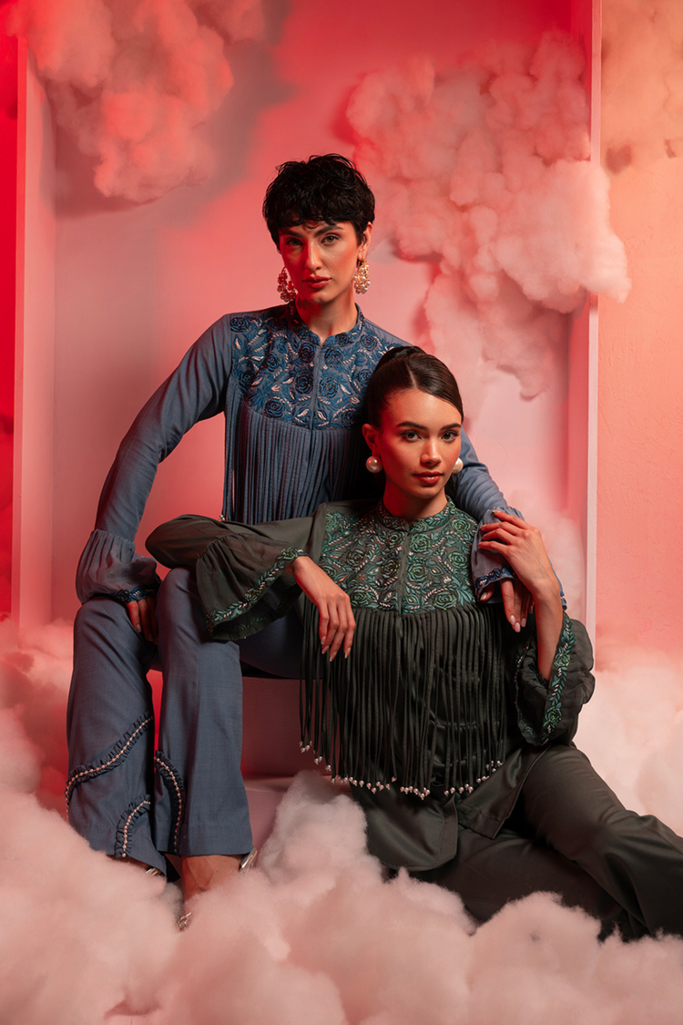 the day dream co-ord stands out with its refined silhouette and intricately embellished pearl embroidery , accents are incorporated on the shirt , pants leading to beautifully flared sleeves that steal the spotlight. Ideal for elegant daytime events or subtle festive wear.