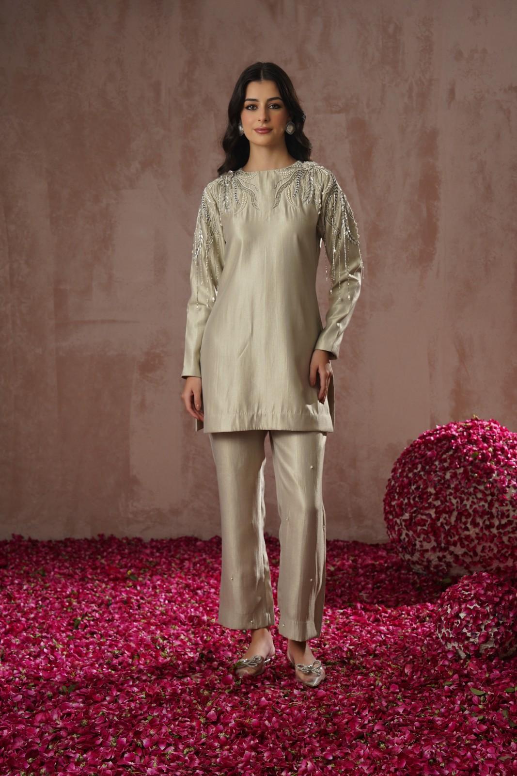 This two piece festive emsemble features a refined straight-cut kurta paired with tailored trousers.The highlight of the...