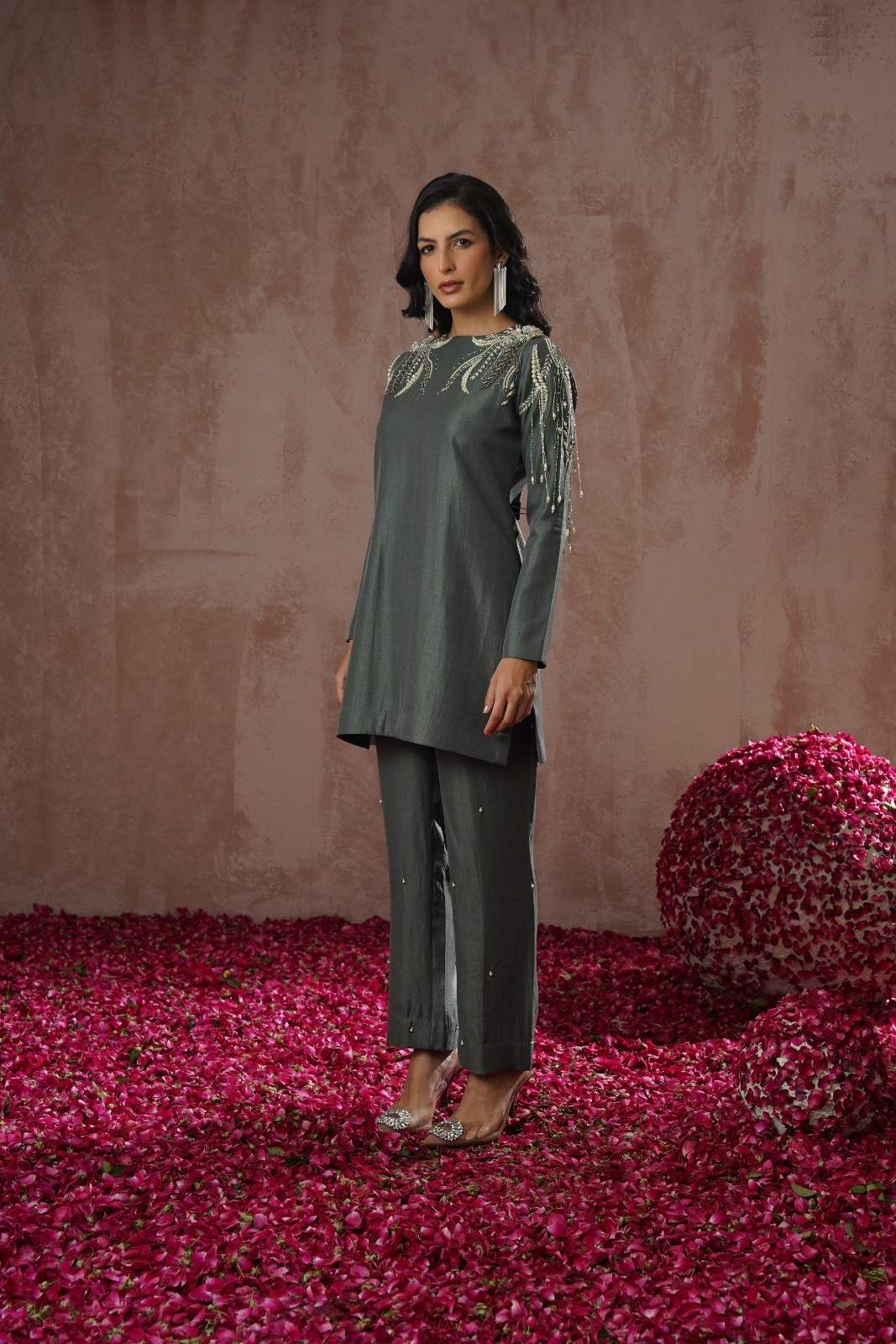 This two piece festive emsemble features a refined straight-cut kurta paired with tailored trousers.The highlight of the...