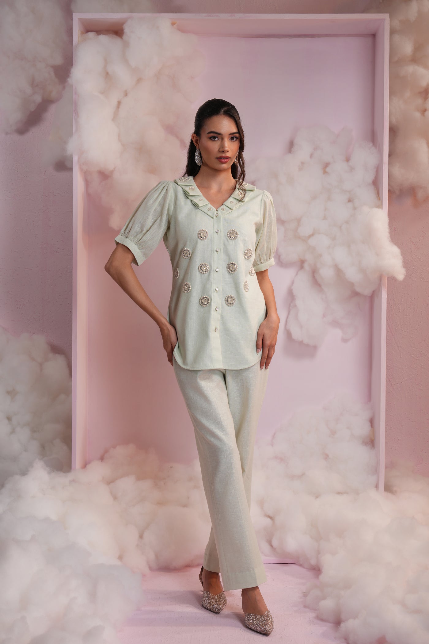 this co-ord is intricately hand embroidered button down silhouette, with a relaxed fit. The pearl and stones...