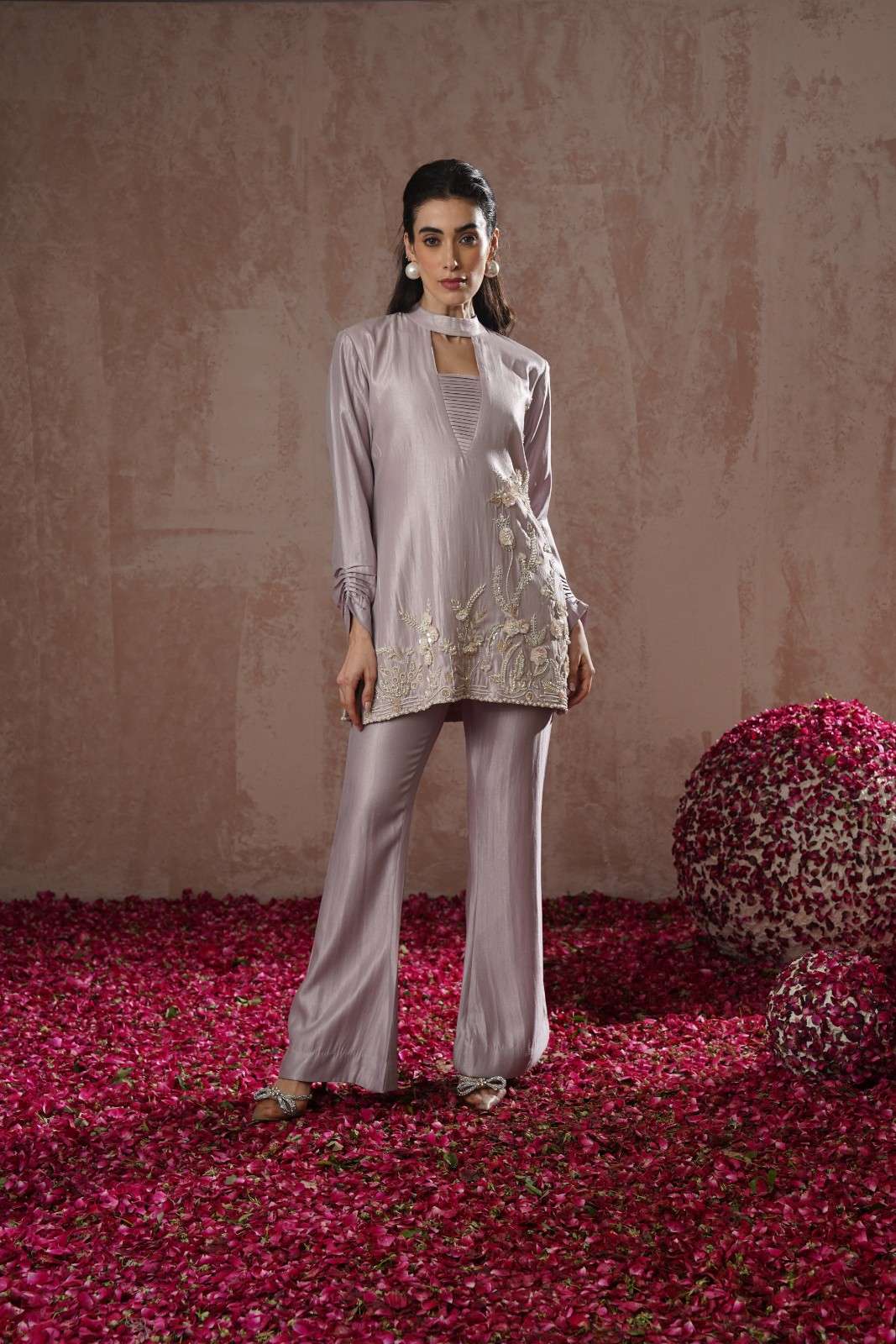 the day dream co-ord stands out with its refined silhouette and intricately embellished pearl embroidery , accents are incorporated on the shirt , pants leading to beautifully flared sleeves that steal the spotlight. Ideal for elegant daytime events or subtle festive wear.