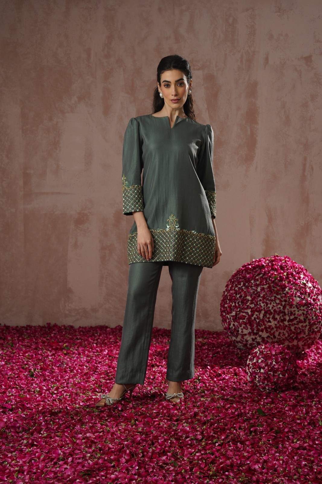 The grace set is a formal ensemble featuring a straight cut kurta and straight pants, detailing on...