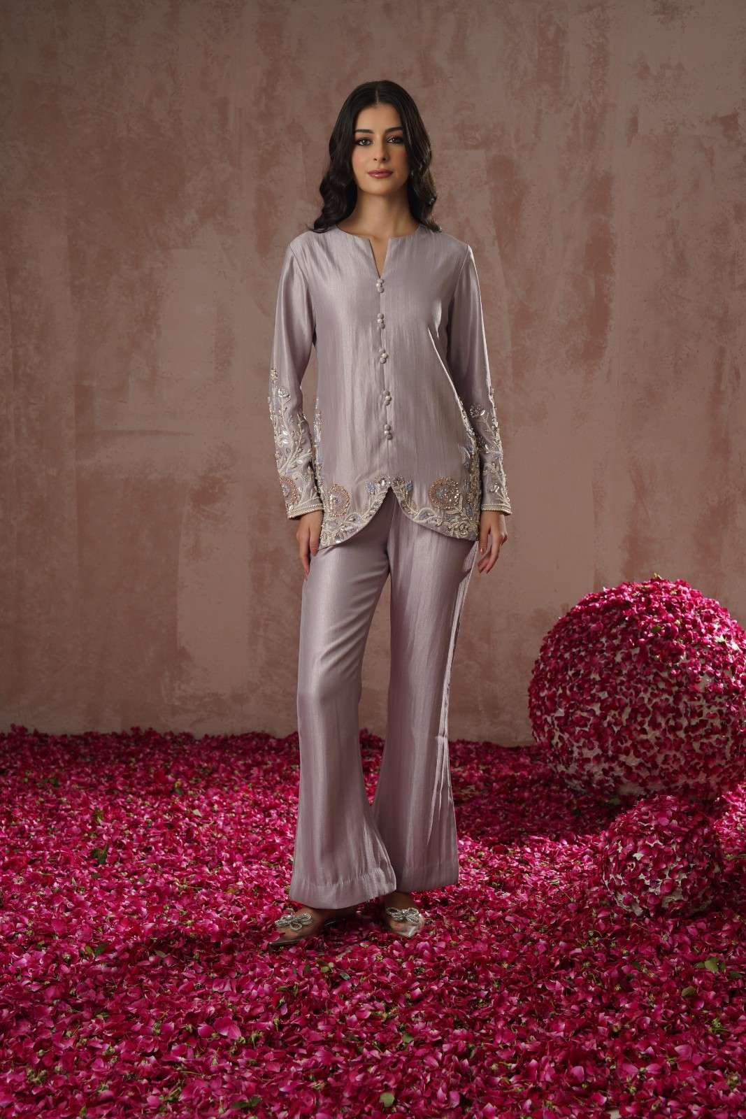 the day dream co-ord stands out with its refined silhouette and intricately embellished pearl embroidery , accents are incorporated on the shirt , pants leading to beautifully flared sleeves that steal the spotlight. Ideal for elegant daytime events or subtle festive wear.