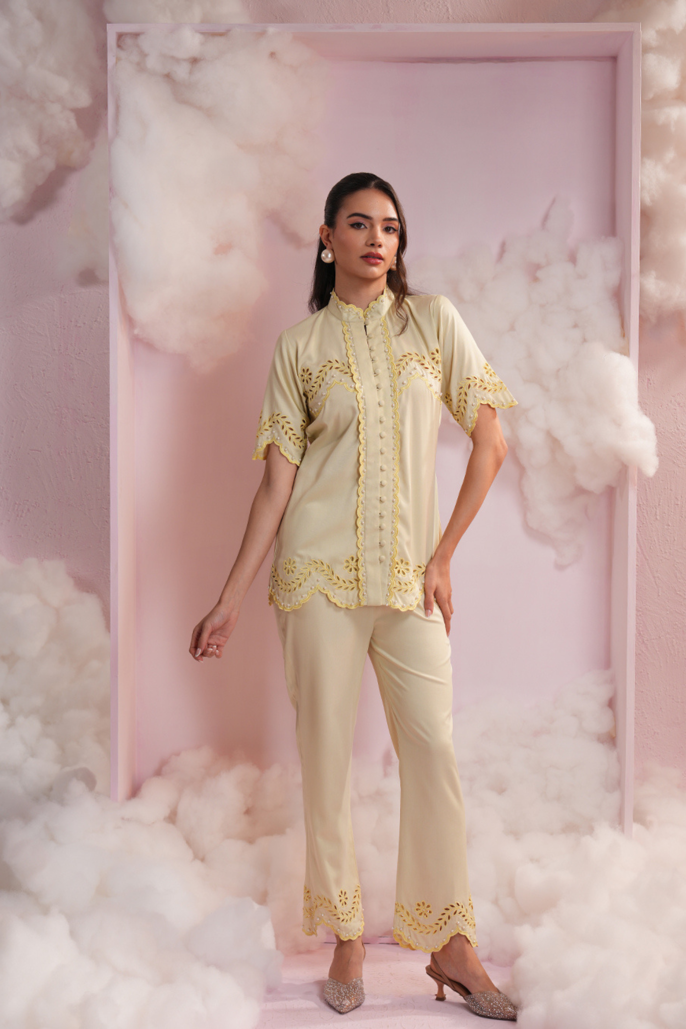 the day dream co-ord stands out with its refined silhouette and intricately embellished pearl embroidery , accents are incorporated on the shirt , pants leading to beautifully flared sleeves that steal the spotlight. Ideal for elegant daytime events or subtle festive wear.