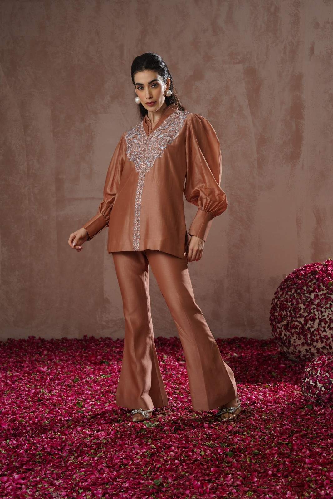 the day dream co-ord stands out with its refined silhouette and intricately embellished pearl embroidery , accents are incorporated on the shirt , pants leading to beautifully flared sleeves that steal the spotlight. Ideal for elegant daytime events or subtle festive wear.