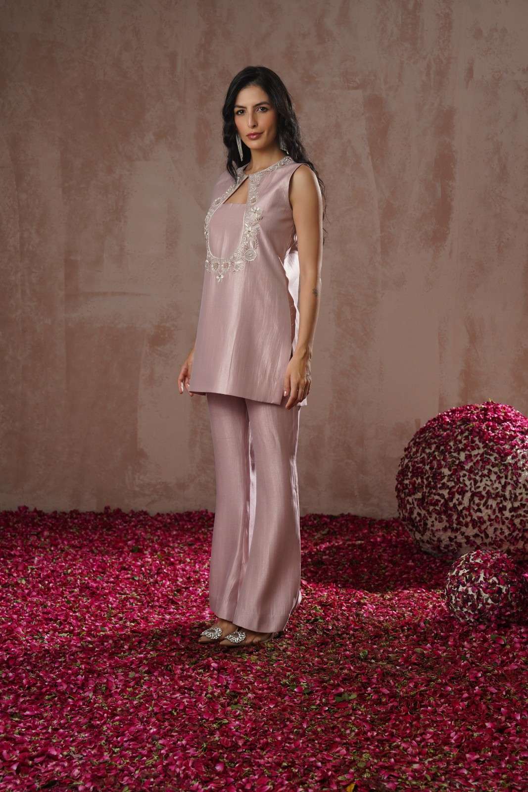 Meera set blend modern tailoring with traditional craftsmanship.The sleeveless tunic features a distinctive keyhole neckline framed by...