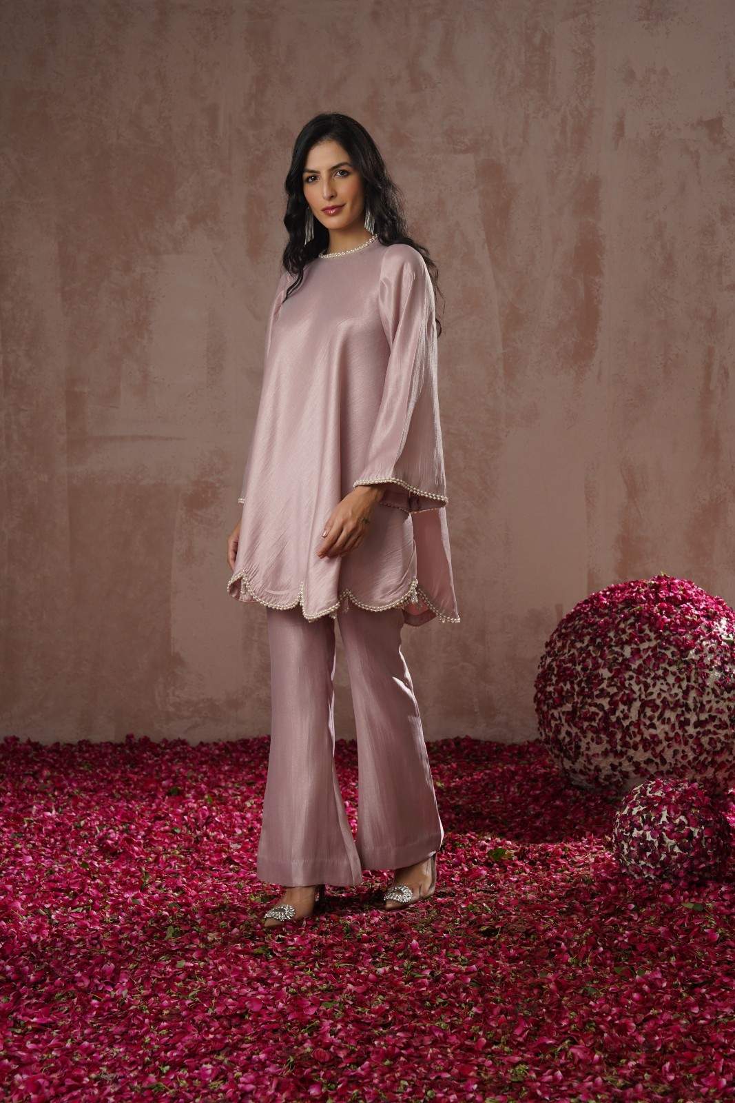 Perlée is featuring a flowing silhouette paired with flared pants for a graceful yet airy look. The hemline , neckline and sleeve edges are adorned with delicate pearl beading in a scalloped design, with cute little hangings, adding a touch of elegance and texture. Perfect for you festive occasions , wedding events.