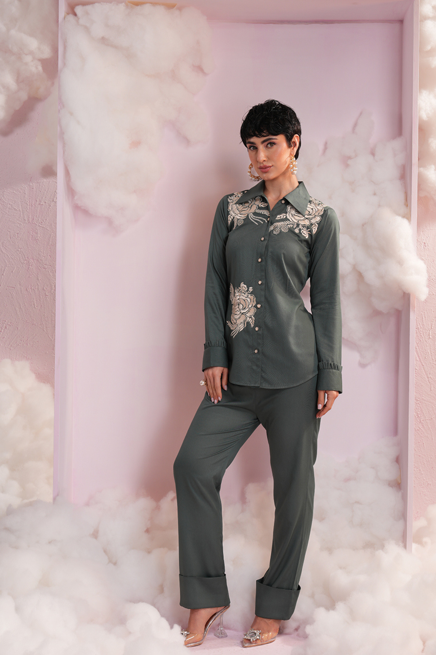 the day dream co-ord stands out with its refined silhouette and intricately embellished pearl embroidery , accents are incorporated on the shirt , pants leading to beautifully flared sleeves that steal the spotlight. Ideal for elegant daytime events or subtle festive wear.